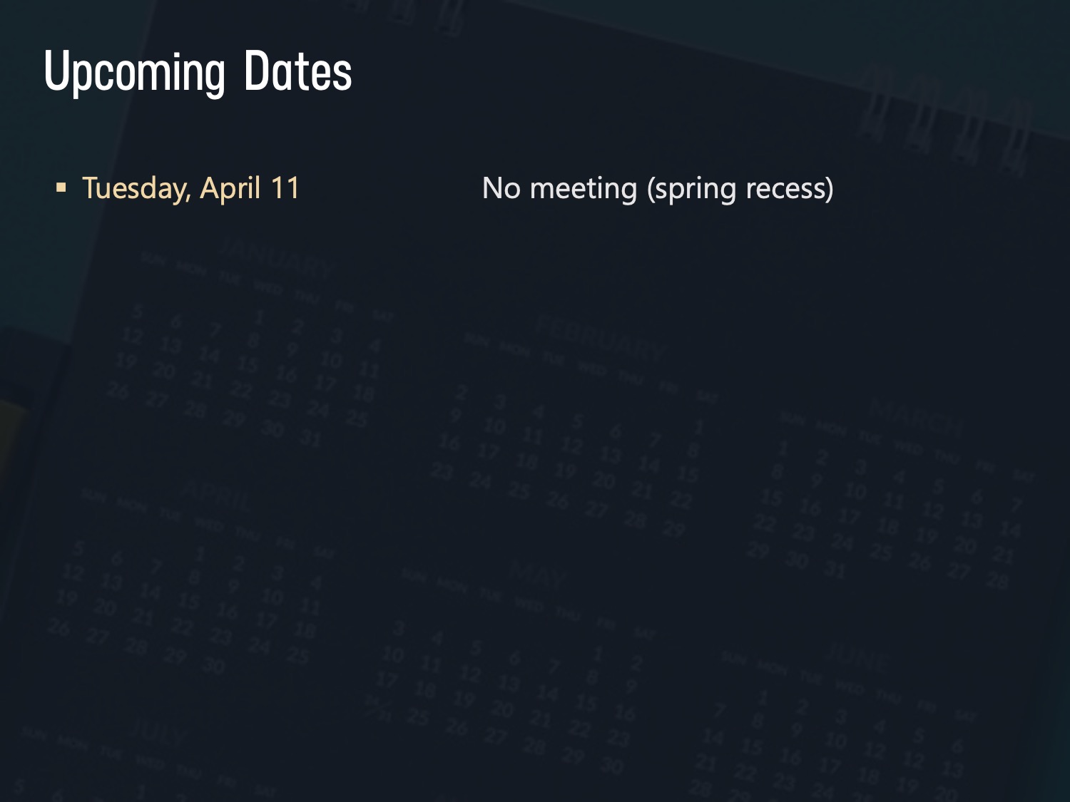 Click on the slide to enlarge in slideshow view, or return to the list of meetings.